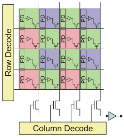 CMOS Image Sensor has photo diodes (PD), same as CCD Image Sensor. But there is difference in the mechanism of transmitting electrons. CMOS transmit electrons using the wire; CCD using CCD itself. The colored elements in the figure correspond the pixels; In color cameras, they are usually filtered red, blue and green.